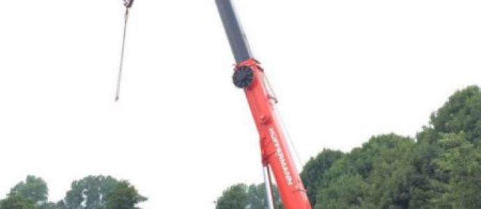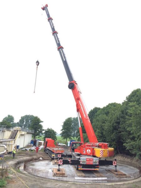 Ovelgönne, Brake – Ende Juli kommt der Hüffermann Kran LTM 1220 mit Kranführer Fabian Stamm im DMK zum Einsatz. Es soll eine Betonstation mit rund 19 t Gewicht gestellt werden. Bevor der 220 Tonner zum Einsatz kommt – werden Baggermatten aus Holz ausgelegt. Der schwere Riese kann so über den unebenen und nassen Boden sicher zu seinem Arbeitsort bewegt werden. Der Kran mit seinem Ballast von 74 t – der mit zwei zusätzlichen LKWs angeliefert werden musste – stand auch während des Einsatzes auf Baggermatratzen. Die Punktlast unter den Kranstützen sowie den Reifen wird so minimiert und der Betonuntergrund geschont. Routiniert lud Fabian Stamm dann bei einer Ausladung von etwa 22 m die Betonstation vom Tieflader und richtete sie passgenau an Ort und Stelle aus. Inklusive Auf- & Abbau des Mobilkrans dauerte der Einsatz rund einen Tag.