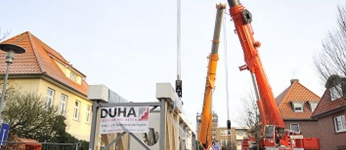 Unser 220- und ein 400-Tonnen-Autokran hoben den Glockenturm gemeinsam an, bevor dieser dann in der Luft gedreht wurde. Durch den geringen Platz auf der schmalen Straße war das Geschick der Kranfahrer gefragt. Autokrane sind jedoch kompakt und leistungsstark und für den kombinierten Straßen- und Geländebetrieb bestens geeignet. Die sogenannten All-Terrain-Krane können Einsatzorte schnell erreichen. Die Achsen sind unabhängig voneinander lenkbar und blockierbar. Der Ballast und die Kontergewichte kann sich der Kran selbst auf einem Anhänger mitnehmen oder diese werden mit 1 bis 2 zusätzlichen Lkw mit Aufliegern separat zur Baustelle gefahren und Vorort aufgelegt. Letztendlich haben es beide Krane zusammen geschafft. Nachdem der Glockenturm dann mitten auf der Straße stand war Fingerspitzengefühl gefragt, denn der Turm musste millimetergenau auf den vorbereiteten Sockel vor der Kirche platziert werden. Dort soll er künftig als Eingang des Kirchengelendes dienen.