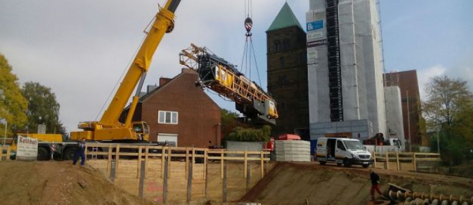 Die Schwierigkeit hierbei war es, den Baukran mittig in der Grube zu platzieren.