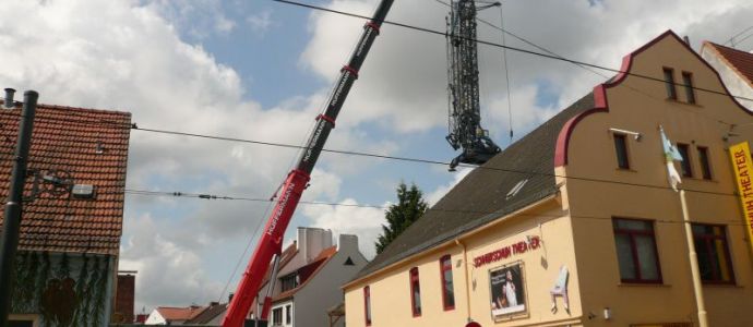 Kraneinsatz von Hüffermann in Bremen. Der Autokran kam zum Einsatz beim Rückbau eines Selbstaufrichters. Der Baukran wurde über die Gebäude gehoben und für den Abtransport vorbereitet.