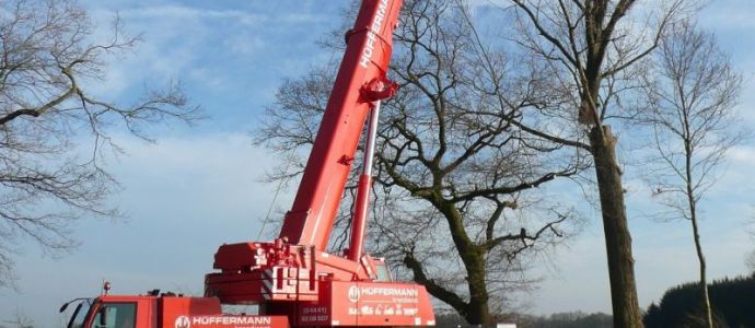 Hüffermann Krandienst half in der Gemeinde Ganderkesee bei einem 14-tägigen Einsatz mit einem 100 to. Kran die Pappeln entlang der B212 auszudünnen.