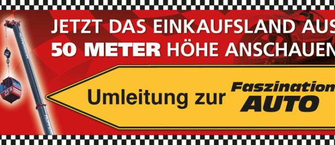 Sei dabei und lass dich von Hüffermann Krandienst in einer Gondel über das famila Einkaufsland in Wechloy heben - Riesanrad-Feeling pur! Wir sind am Freitag, den 23.05.2014 von 12:00-18:00 Uhr und am Samstag, den 24.05.2014 von 09:00-18:00 Uhr im Rahmen der Autoshow "Faszination Auto" für euch vor Ort.