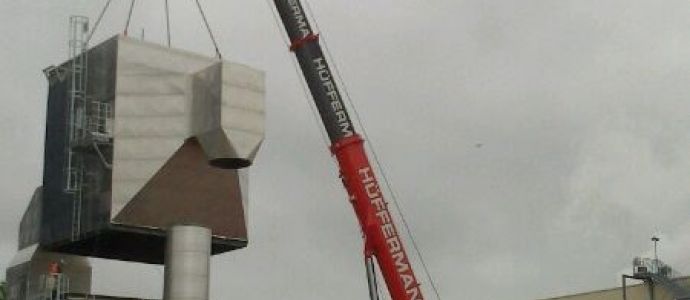 Mit einer Hakenhöhe von 32m und 14m Auslage wurde mit unserem 350to-Kran die Filteranlage in einem Biomassekraftwerk montiert.