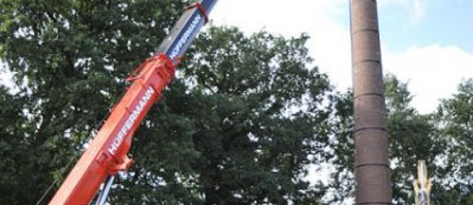 Nun wird die jahrelange Planung endlich umgesetzt. Aus den letzten Resten der Färberei soll nun ein Studentenwohnheim, sowie Wohnungen für Kleinfamilien errichtet werden. Früher war es ein sichtbares Wahrzeichen der Stadt und heute nur noch eine Bauruine.Aus diesem Grund war unser LTM 1100-5.2 auf dieser Baustelle im Einsatz und hat die letzten Reste des alten Schornsteins der Färberei zusammen mit einem Bagger abgetragen.
