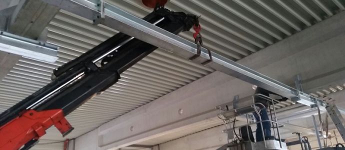 Mit Hilfe des Ladekrans und einer Gelenkteleskopbühne wurden Eisenträger an Decken montiert. Die Schwierigkeiten dabei waren die geringen Platzverhältnisse in der Halle und die Absprachen zwischen Kran und Arbeitsbühnenpersonal.
