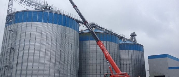 Mit Hilfe eines 100 to Kranes von Hüffermann Krandienst GmbH wurde auf mehreren Silos ein Laufsteg montiert.