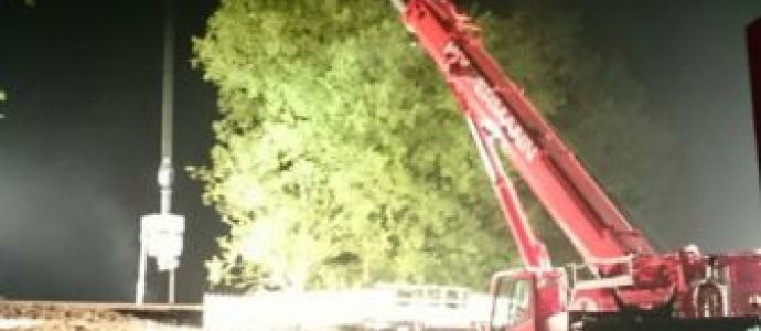 Soltau (Han) - Dank Lichtmast heller Einsatz in der Nacht bei Demontage der Hilfsbrücke an Gleisen der Heidebahn.