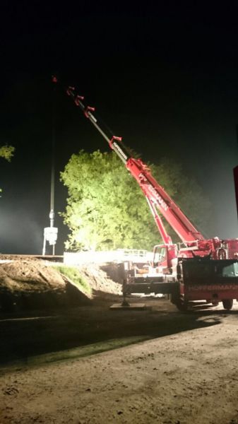 Während zwei Nachteinsätzen und unter Einsatz von Lichtmast wurde die Baustelle an der Heidebahn wieder in den Originalzustand versetzt. Nachdem der Fluss Durchlass erneuert wurde kam der Kran zum Ziehen der Spundwände sowie der Demontage der Hilfsbrücke zum Einsatz. Um den Betrieb der Heidebahn / Regionalbahn nicht unterbrechen zu müssen, fand der Einsatz in der Nacht unter Einsatz von Lichtmasten statt. Während der Baumaßnahmen dienten die Spundwände als Stützen für die Eisenbahnhilfsbrücke.