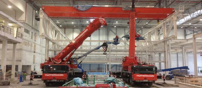 Zwei Tage lang waren zwei LTM 1100 von uns im Großeinsatz in einer Halle. Unsere Kranfahrer Dieter Jacobs und Heiner Kluck mussten dort eine Kranbahn montieren.