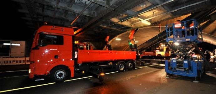 In Bremen wurde eine Fußgängerbrücke zwischen zwei bestehenden Eisenbahnbrücken mon-tiert. Hierbei kamen drei Ladekrane und ein neuer Baustoffzug des Hüffermann-Fuhrparks zum Einsatz. Der Einsatz musste nachts durchgeführt werden, da am Tage die Eisenbahn-schienen zu stark befahren werden.