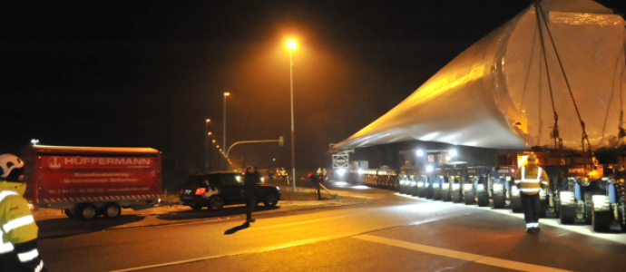 Unsere Mitarbeiter der Schwertransportbegleitung Jens Martin und Tobias Busse waren für die Verkehrssicherung und die verkehrslenkenden Maßnahmen in Bre-merhaven verantwortlich. Es wurde ein 88 m, langer Flügel für eine 8 Megawatt Windkraftanlage transportiert und begleitet. Dafür mussten parkende PKW abge-schleppt werden und Ampeln, Schilder und andere Hindernisse wurden demontiert.