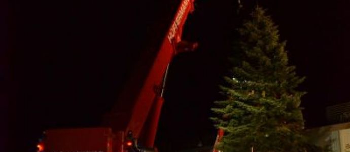 Weihnachtsbaumaufrichtung mit Autokran von Hüffermann