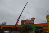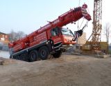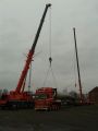 Da die Durchfahrt frei bleiben musste, konnte unser Kran unter erschwerten Bedingungen nur von der Sohlplatte aus arbeiten. Mit unserem 70t-Kran LTM 1070 4.2 von Liebherr wurden Kellerwände aufgestellt.
