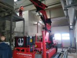 Unser elektrischer Montageladekran war in den Industriewerken Höltinghausen im Einsatz. Um die Arbeit wie geplant durchführen zu können, mussten zunächst die Wände rund um den zu hebenden Hydraulikzylinder demontiert werden. Anschlie-ßend wurde dieser mit einem Schwanenhals gelöst, ausgehoben und abgelassen. …